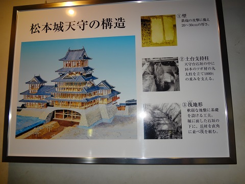 さて松本城はどうだったでしょうか、松本盆地のほぼ中央にあり平城といわれる城です。城内に説明用のパネルがありましたが、軟弱地盤に建設したようで、基礎には「いかだ地業」といわれる地盤改良が行われていました。さらに石垣の中には、木製の杭を打込むなど構造的に工夫がみられます。
